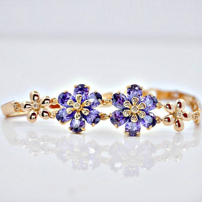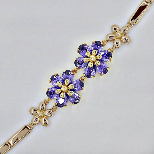 Браслет с фиолетовыми фианитами в форме цветов оптом, натуральная позолота модель 72603