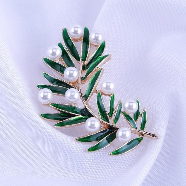 Брошь "Зеленая веточка с жемчугом" 8763