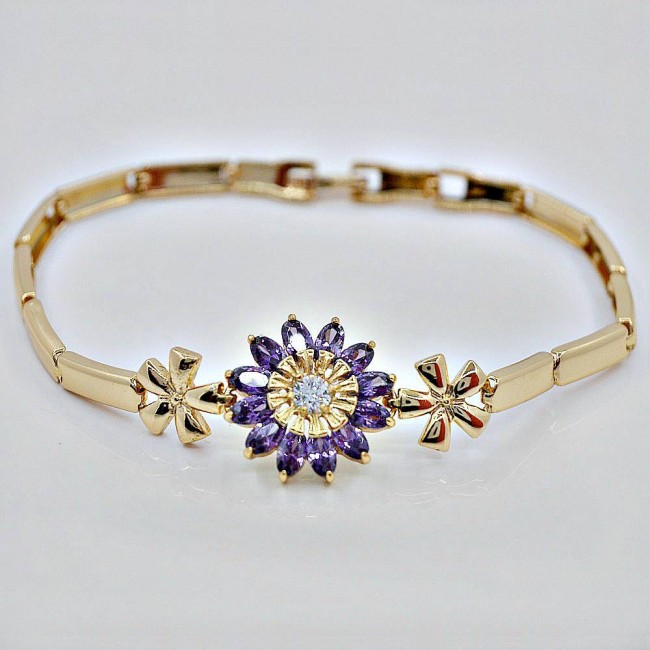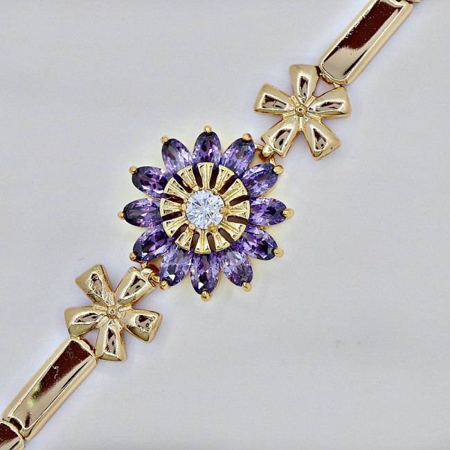 Цветочный браслет с фиолетовым фианитом оптом, натуральная позолота модель 72794