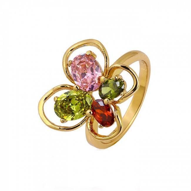 Кольцо в форме цветка с разноцветными фианитами оптом, модель 10837