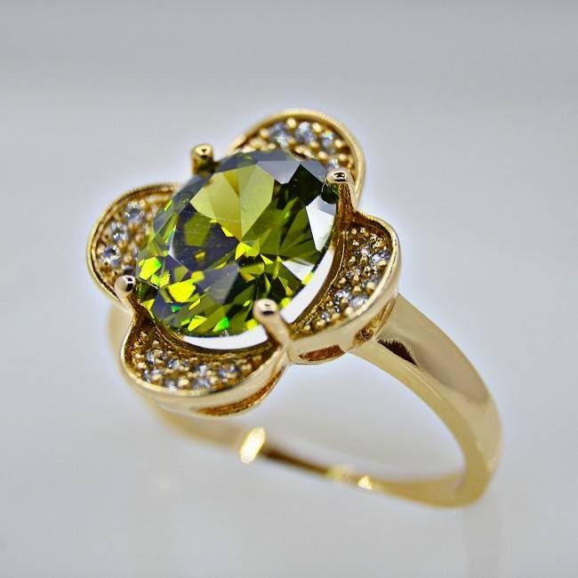 Кольцо с большим зеленым фианитом оптом, искусственный бриллиант на лепестках, модель 11263.