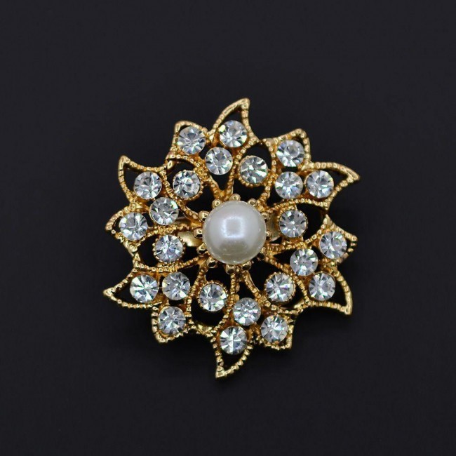 Позолоченная брошь с фианитами и жемчугом 254-65