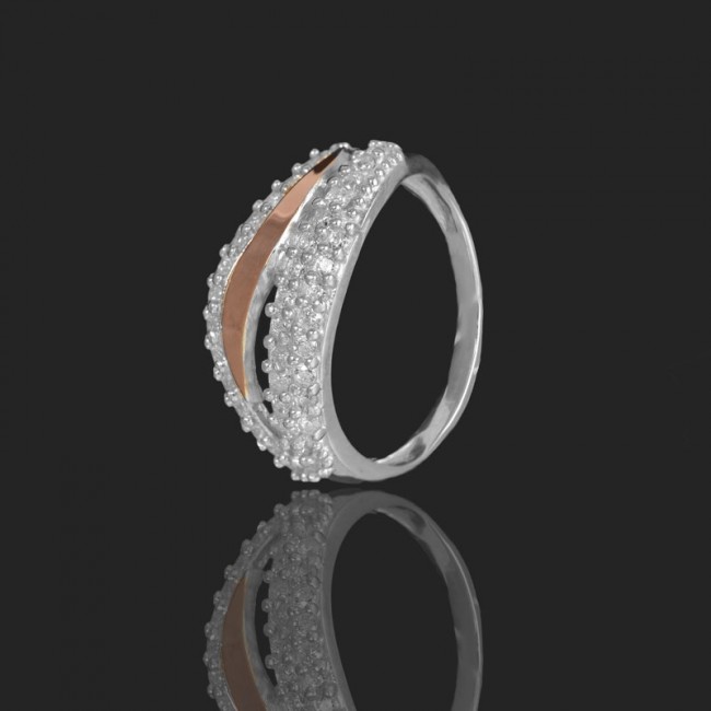 Кольцо выполнено из серебра 925 пробы с напаянными пластинами золота 375 пробы, вставки фианит