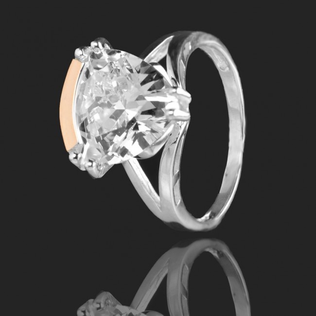 Кольцо выполнено из серебра 925 пробы с напаянными пластинами золота 375 пробы, вставки фианит