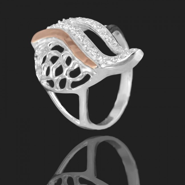 Кольцо выполнено из серебра 925 пробы с напаянными пластинами золота 375 пробы, вставки циркон