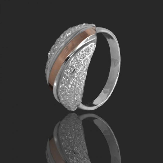 Кольцо выполнено из серебра 925 пробы с напаянными пластинами золота 375 пробы, вставки циркон