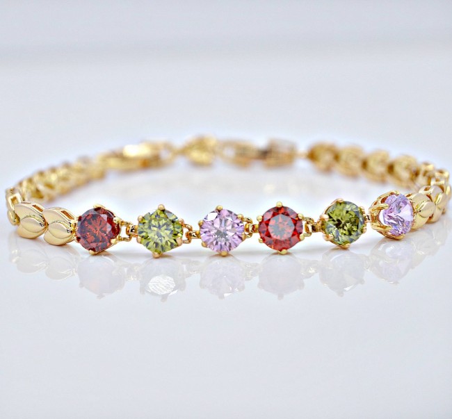 Браслет с темными разноцветными фианитами оптом, натуральная позолота модель 70892