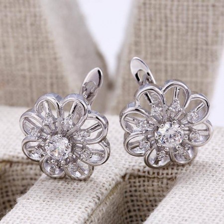 Сережки с белыми фианитами в форме цветка оптом, модель 26526